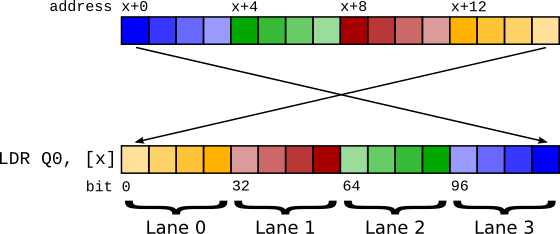A vector is a consecutive sequence of items that are operated on simultaneously. To load a 64-bit vector, 64 bits need to be read from memory. In little endian mode, we can do this by just performing a 64-bit load - LDR q0, [foo]. However if we try this in big endian mode, because of the byte swapping the lane indices end up being swapped! The zero’th item as laid out in memory becomes the n’th lane in the vector.