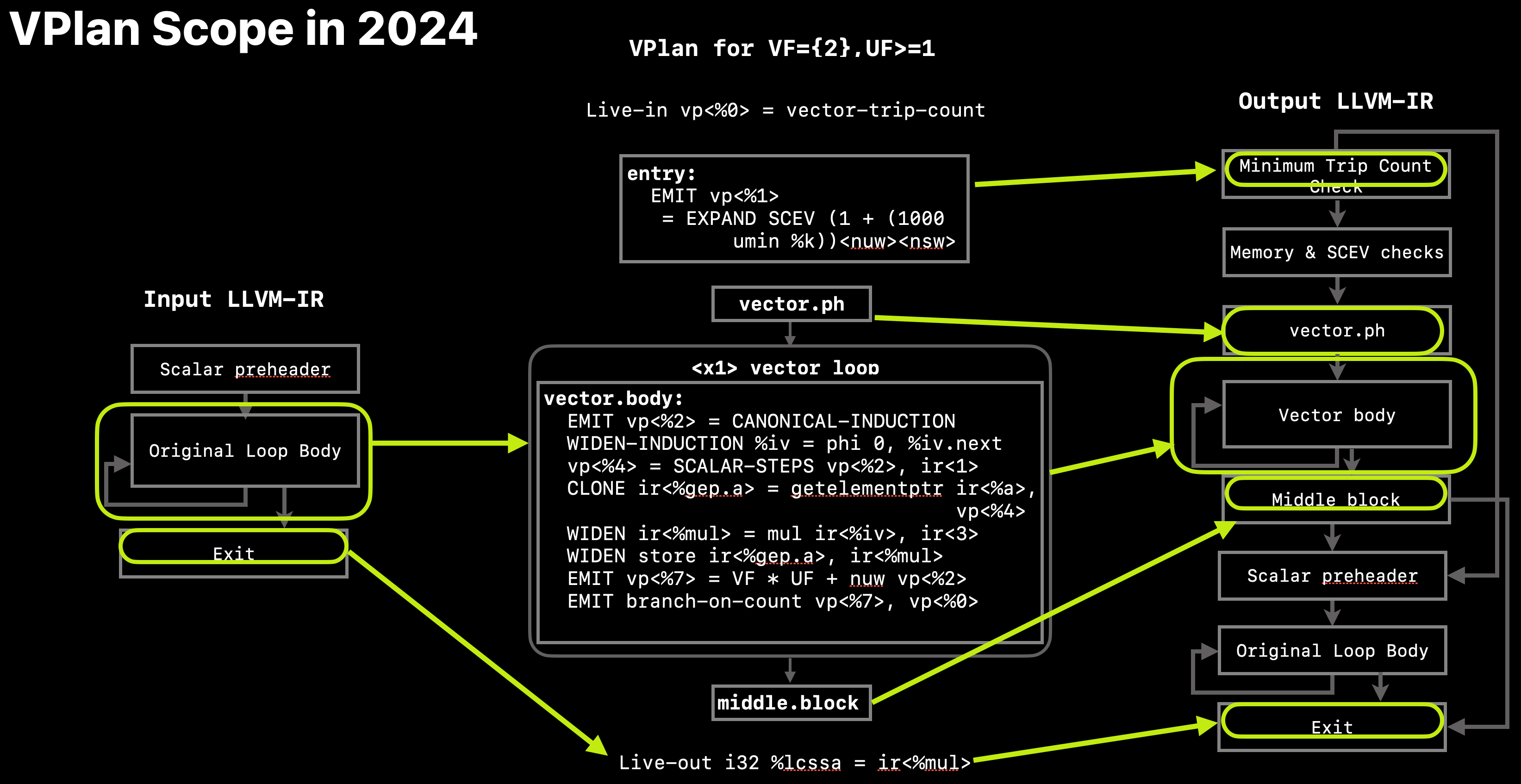 VPlan currently models the complete vector loop, as well as additional parts of the vectorization skeleton. Refer to Fig. 4 for an overview of the scope covered by VPlan.